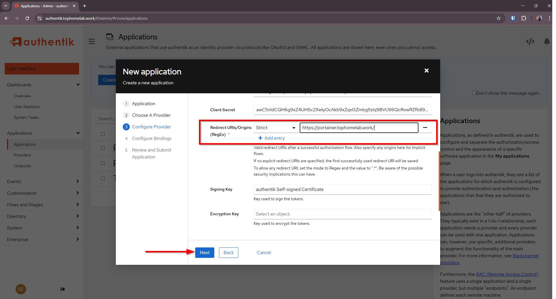 Select Redirect URI (your portainer fully qualified domain name) adn click Next